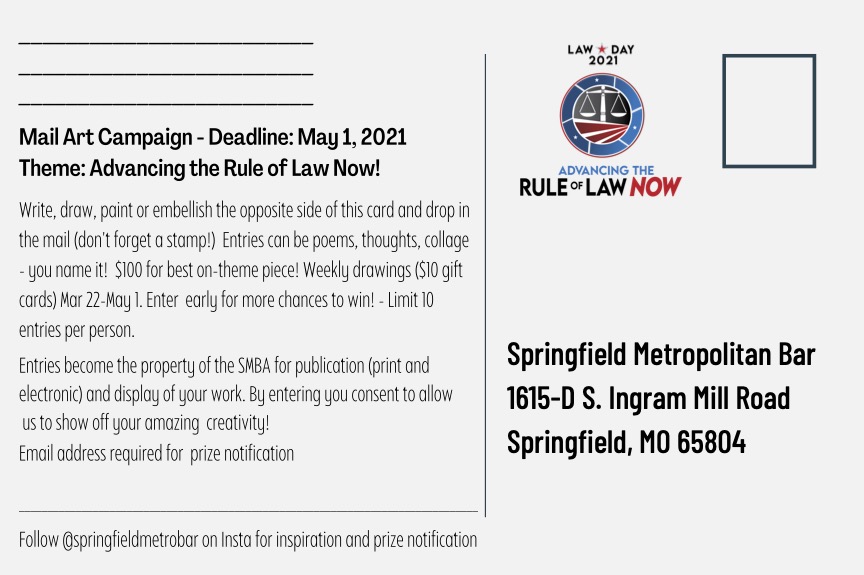 SMBA Law Day Mail Art Campaign! Follow us for updates and inspiration! Click here to follow @springfieldmetrobar on Instagram Click here to follow @springfieldbar on Facebook Theme: Advancing the Rule of Law Now! Deadline – May 1, 2021. Limit – 10 entries per person, all ages - everyone, everywhere is welcome to participate. One of the interesting and unexpected things that emerged from 2020 was a resurgence of mail art, as people had to stay home and looked for creative ways to stay connected. We are embracing that and introducing a new law day event. Write, draw, paint or otherwise embellish a 4" x 6" card, and drop in the mail to SMBA, 1615-D S. Ingram Mill Road, Springfield, MO, 65804. Include your name, address, email and phone so we can contact our drawing and grand prize winners! Entries can include your poems, thoughts, drawings, paintings, collage – you name it! $100 for best on-theme piece plus weekly drawings ($10 gift cards) March 22 – May 1. Enter early for more chances to win. Need inspiration? Check out the ABA website and other websites on Rule of Law. Entries become the property of the SMBA for reproduction, publication (print and social media) and display of your work, along with your name and city. By entering you consent letting us show off your great work and giving you some free PR! Any questions? Email info@springfieldbar.com Need inspiration? Check out our Facebook Gallery. If you would like to pick up some postcards like the one below they are available at the Springfield Art Museum and all Springfield Greene County Libraries locations!